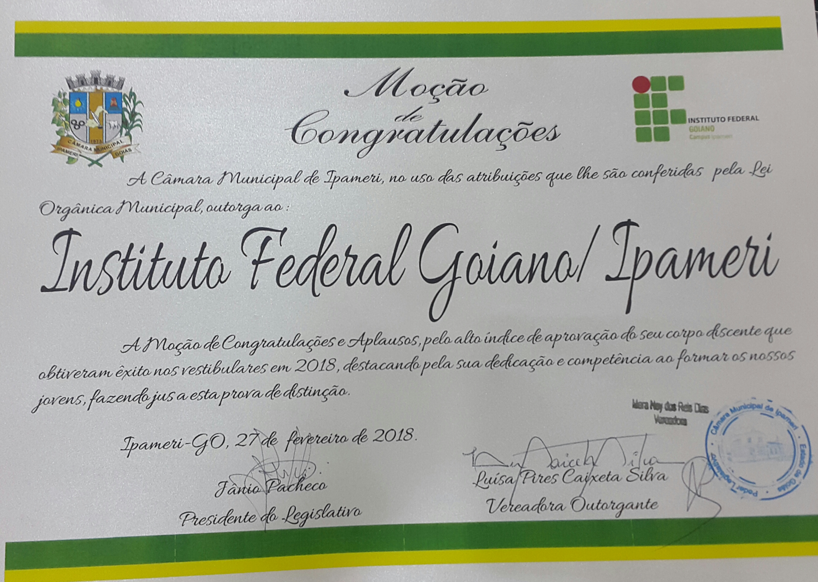A Câmara Municipal de Ipameri, em sessão solene realizada na tarde de 27 de fevereiro, concedeu ao IF Goiano - Campus Avançado Ipameri a Moção de Congratulações e Aplausos em virtude do elevado índice de aprovações dos discentes do Campus em processos seletivos de Instituições de Ensino Superior (IES).