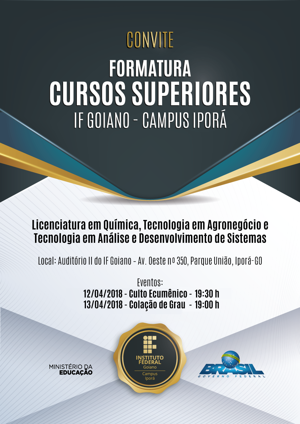 Acontece nos dias 12 e 13 de abril as cerimônias de formatura dos concluintes de cursos superiores do IF Goiano Campus Iporá no ano de 2017.