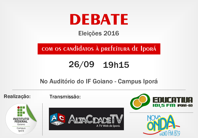 Aconteceu na noite desta segunda-feira, 26, o debate entre os candidatos à prefeitura de Iporá, promovido pelo Instituto Federal Goiano (IF Goiano) – Campus Iporá, em parceria com a...