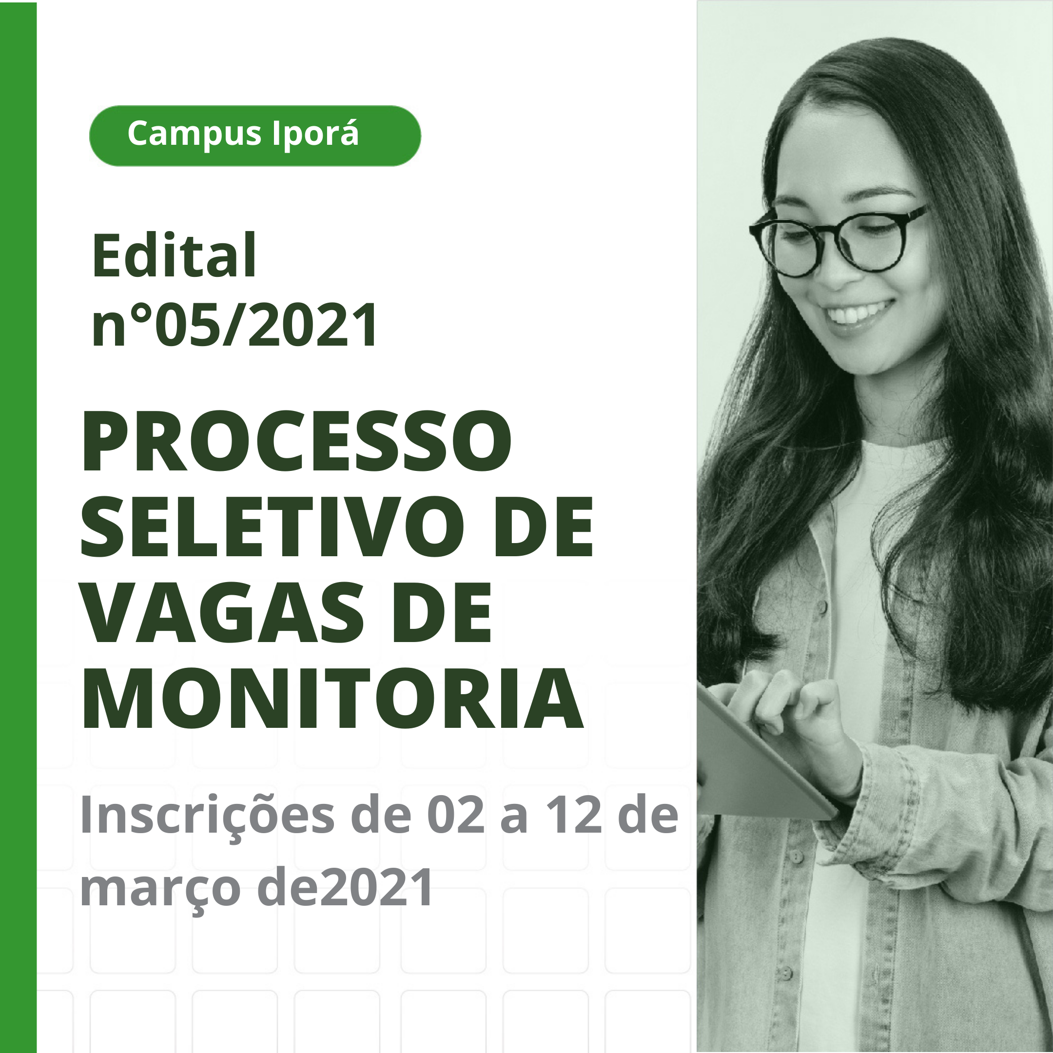 O IF Goiano – Campus Iporá divulgou o edital nº 13/2021 referente à seleção de bolsistas para atuarem como Professor Formador/Orientador de Trabalho de Conclusão de Curso (TCC)...