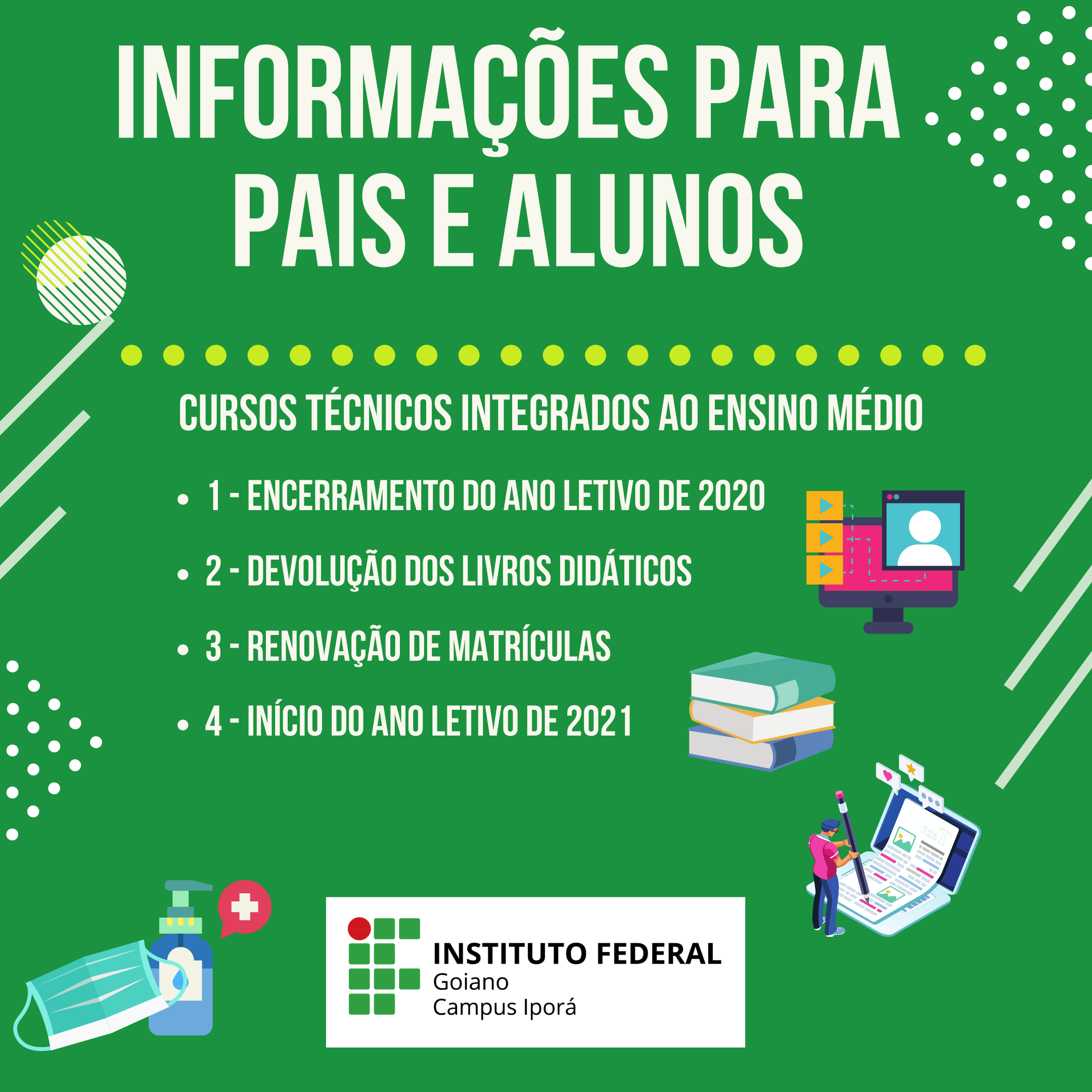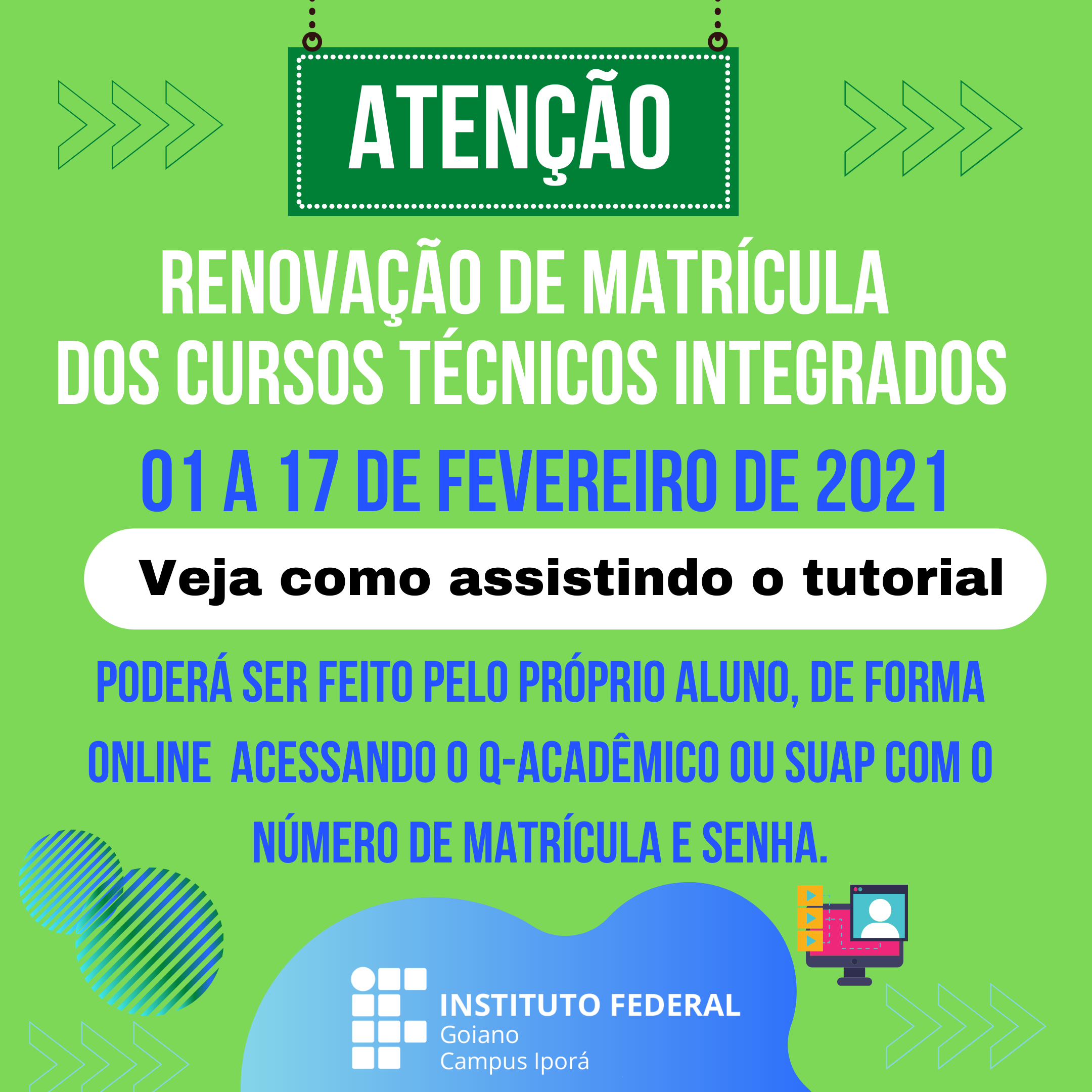 O período de renovação das matrículas dos cursos técnicos integrados do IF Goiano Campus Iporá será de 01/02/2021 a 17/02/2021, Veja como fazer assistindo os tutoriais.