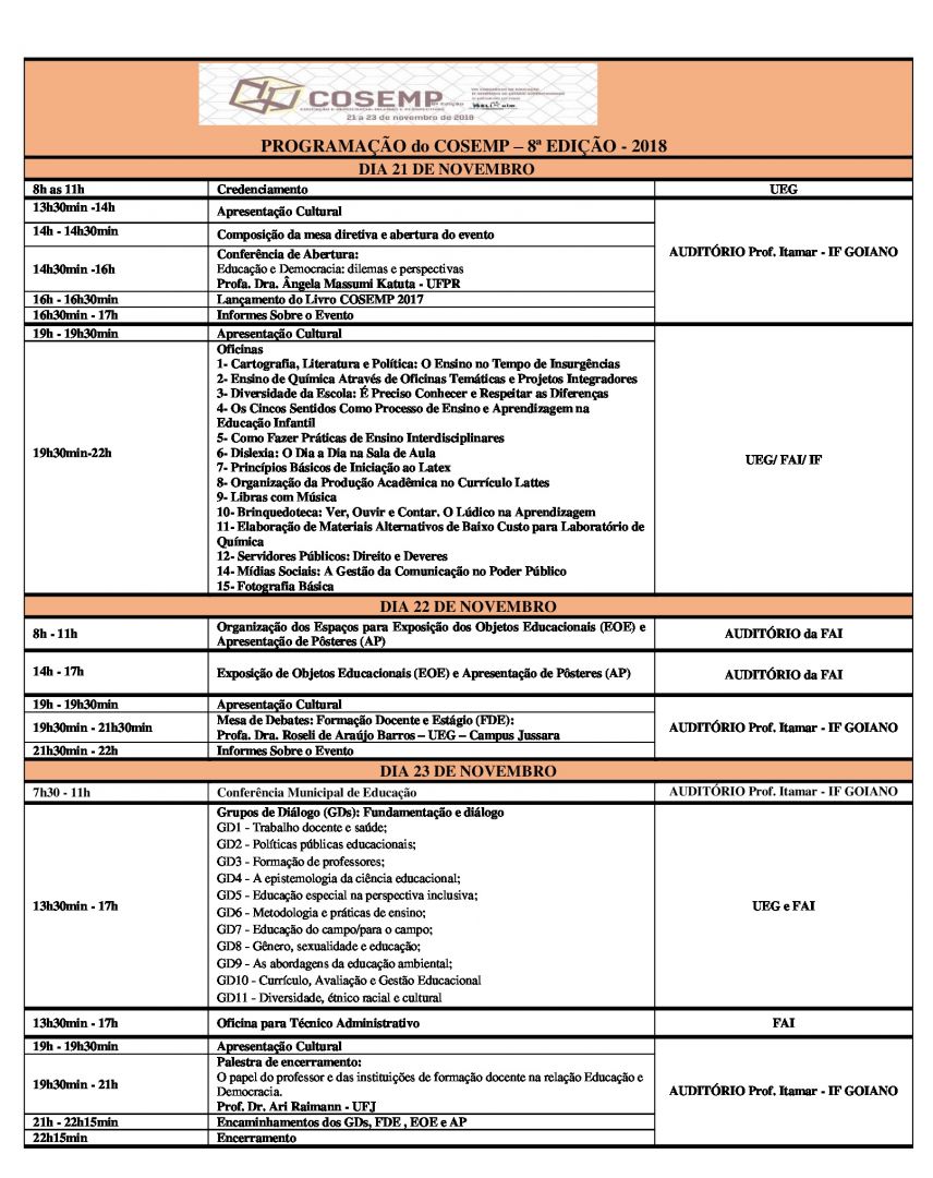 De 21 a 23 de novembro de 2018, a Universidade Estadual de Goiás - Câmpus Iporá, em parceria com o Instituto Federal Goiano – Campus Iporá, a Faculdade de Iporá, a Secretaria Municipal de Educação, a Coordenação Regional de Educação, Cultura e Esportes de Iporá, realizará a 8ª edição do Congresso de Educação – 8º COSEMP.