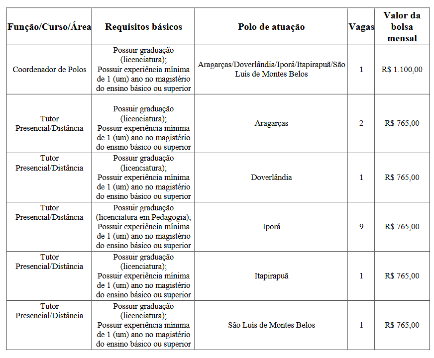 Os bolsistas atuarão nos Polos de Apoio Presencias e sede do IF Goiano Campus Iporá, no Curso de Licenciatura em Pedagogia na modalidade a distância no âmbito do sistema Universidade Aberta do Brasil (UAB).