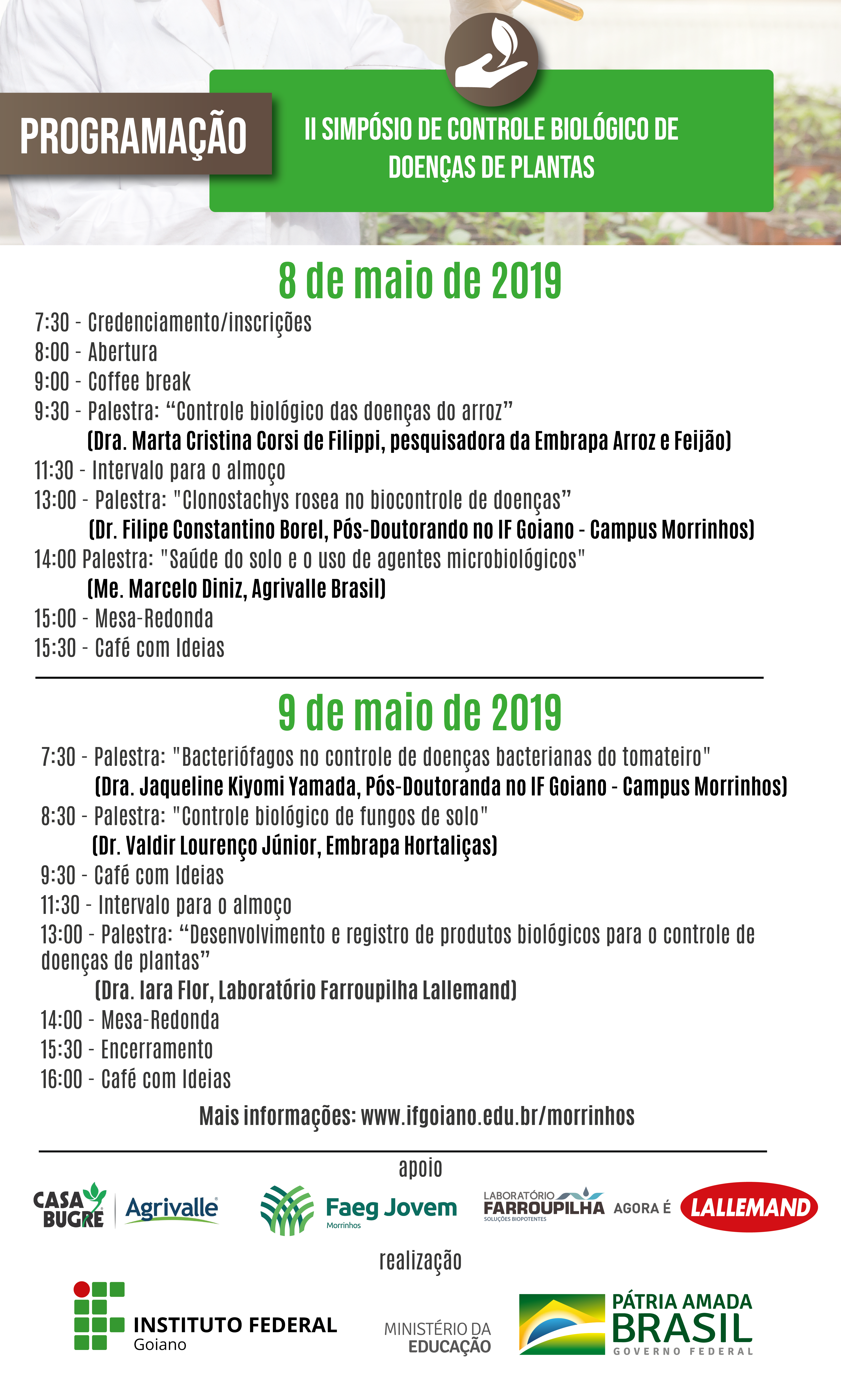 O IF Goiano - Campus Morrinhos irá realizar nos dias 8 e 9 de maio o II Simpósio de Controle Biológico de Doenças de Plantas.