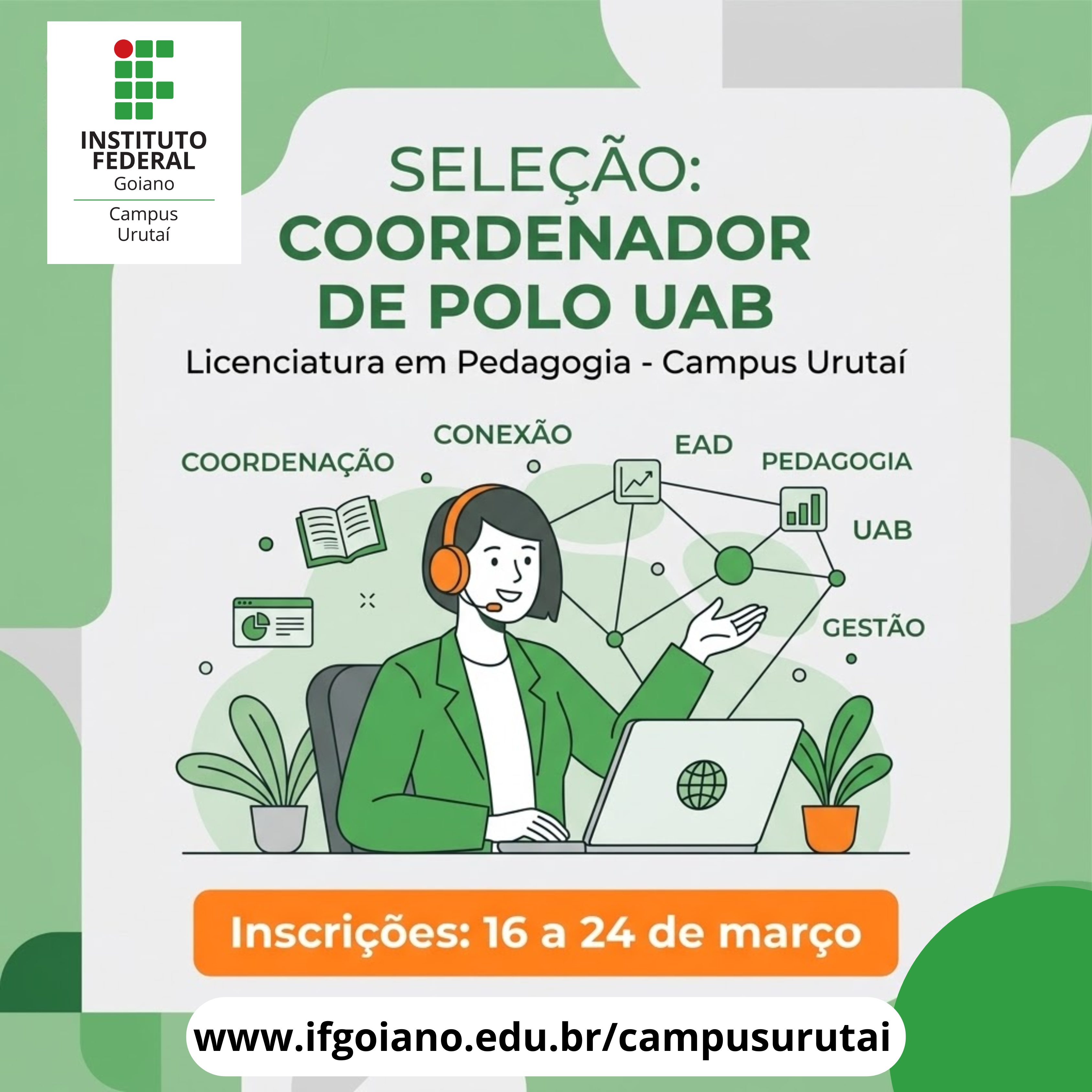 O Instituto Federal Goiano (IF Goiano) – Campus Urutaí torna pública a abertura do Edital nº 07/2026, destinado à seleção de bolsista para a função de Coordenador de Polo. O selecionado atuará no curso de Licenciatura em Pedagogia, no âmbito do Sistema Universidade Aberta do Brasil (UAB), na modalidade a distância.