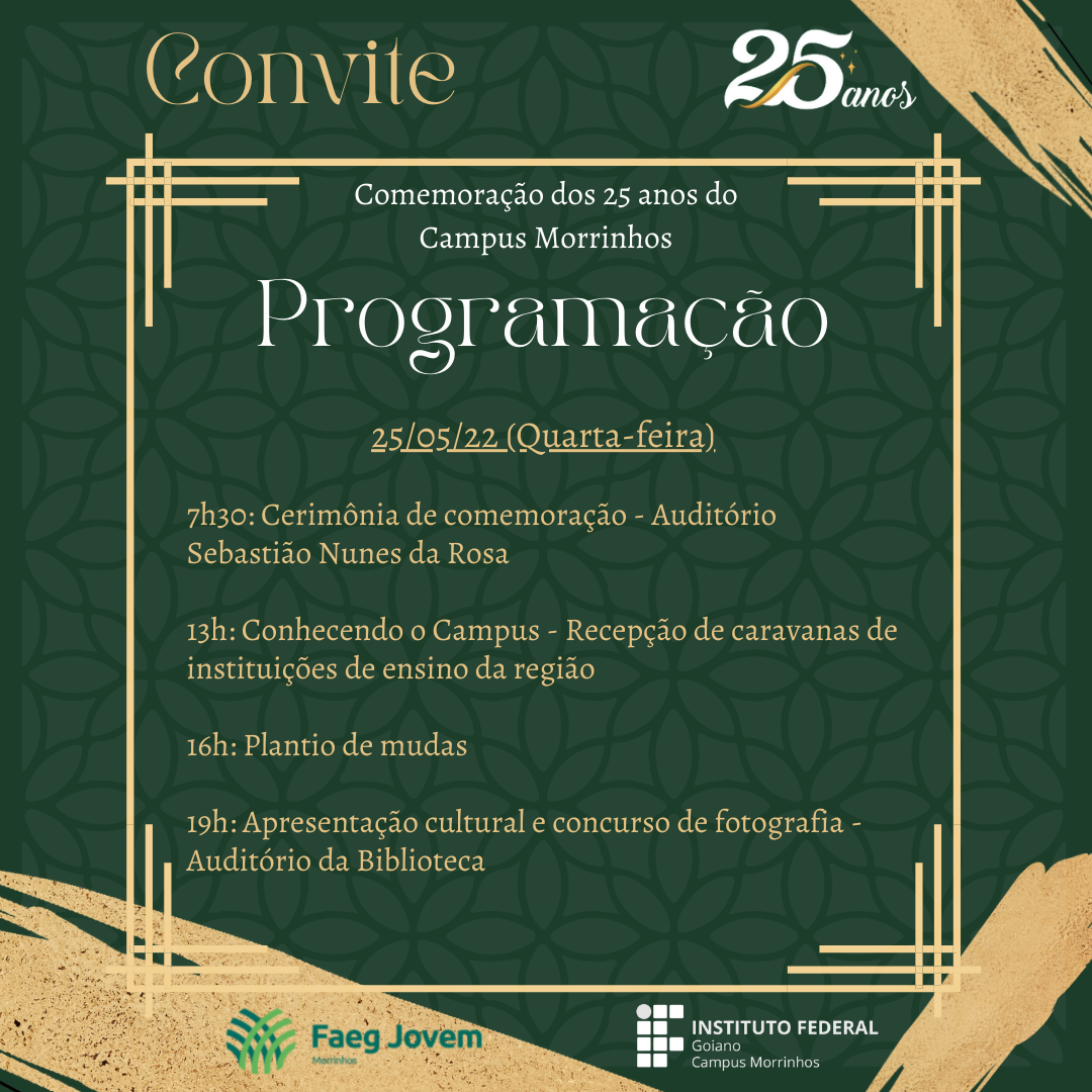 Neste ano de 2022, o IF Goiano - Campus Morrinhos completa 25 anos de existência. O evento de comemoração do aniversário será realizado no dia 25 de maio e contará com uma programação especial para este dia tão importante. A instituição divulga o convite (veja abaixo) e espera a presença de todos: alunos, servidores, terceirizados e comunidade externa.