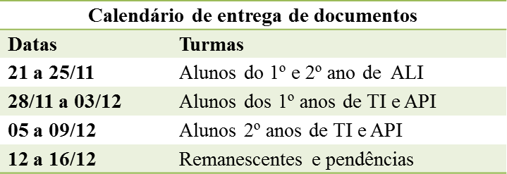 O cumprimento da entrega dentro do prazo estipulado é de extrema importância para arquivar a documentação completa e em melhor qualidade para que seja anexada ao novo sistema, o Suap. Os documentos originais que devem ser apresentados para que sejam escaneados pela Unidade de Registros Escolares (Secretaria) são: RG e CPF; Histórico do ensino fundamental; Certidão de nascimento; Foto 3x4; Comprovante de endereço.