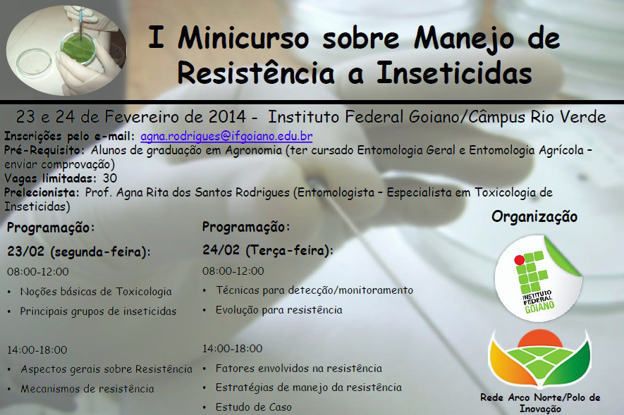 Encerrou-se nesta terça feira (24/02), com 13 participantes o I Minicurso sobre manejo de Resistência a Inseticidas. O evento foi organizado pela Rede Arco Norte/Polo de Inovação do IF Goiano e contou com o apoio da DPPG, DIREX do IF Goiano - Câmpus Rio Verde, IHARA Brasil e do Comitê Brasileiro de Ação à Resistência de Inseticidas (IRAC-BR).