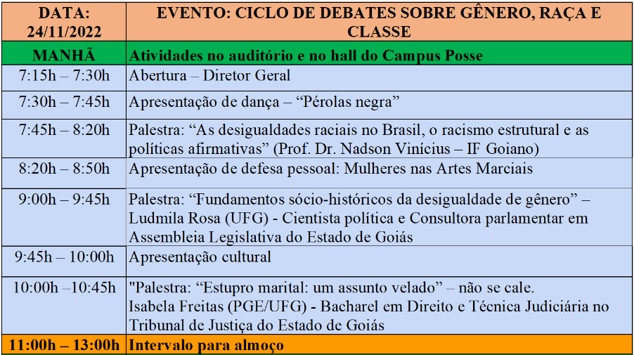 O IF Goiano Campus Posse convida toda a comunidade interna e externa para o evento de extensão intitulado “Ciclo de debates sobre gênero, raça e classe”, que acontecerá no dia 24 de novembro de 2022 no IF Goiano Campus Posse.
