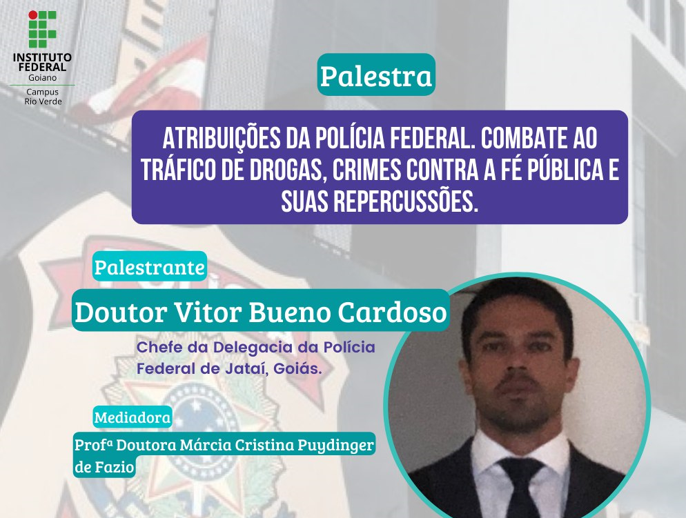O delegado da Polícia Federal de Jataí, Vítor Bueno Cardoso, estará no campus na quarta-feira, dia 31, para uma palestra sobre tráfico de drogas e fraudes contra o serviço público....