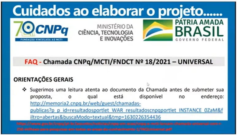 Quem perdeu a transmissão ao vivo de um bate-papo sobre como adequar seu projeto para submissão à Chamada CNPq/MCTI/FNDCT Nº 18/2021 - UNIVERSAL pode assistir a gravação. Só...