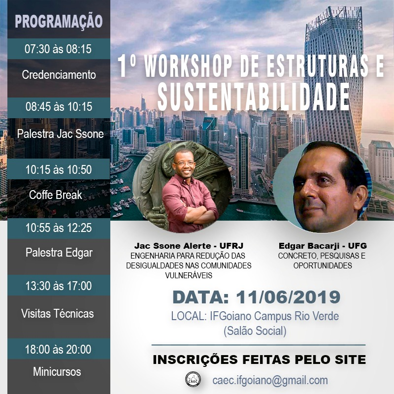Na programação, visitas técnicas, minicursos e palestras com Jac Saone Alerte da Universidade Federal do Rio de Janeiro (UFRJ), com o tema " Redução das desigualdades nas comunidades vulneráveis" e Edgar Barcarji da Universidade Federal de Goiás, com o tema "Concreto, Pesquisas e Oportunidades".