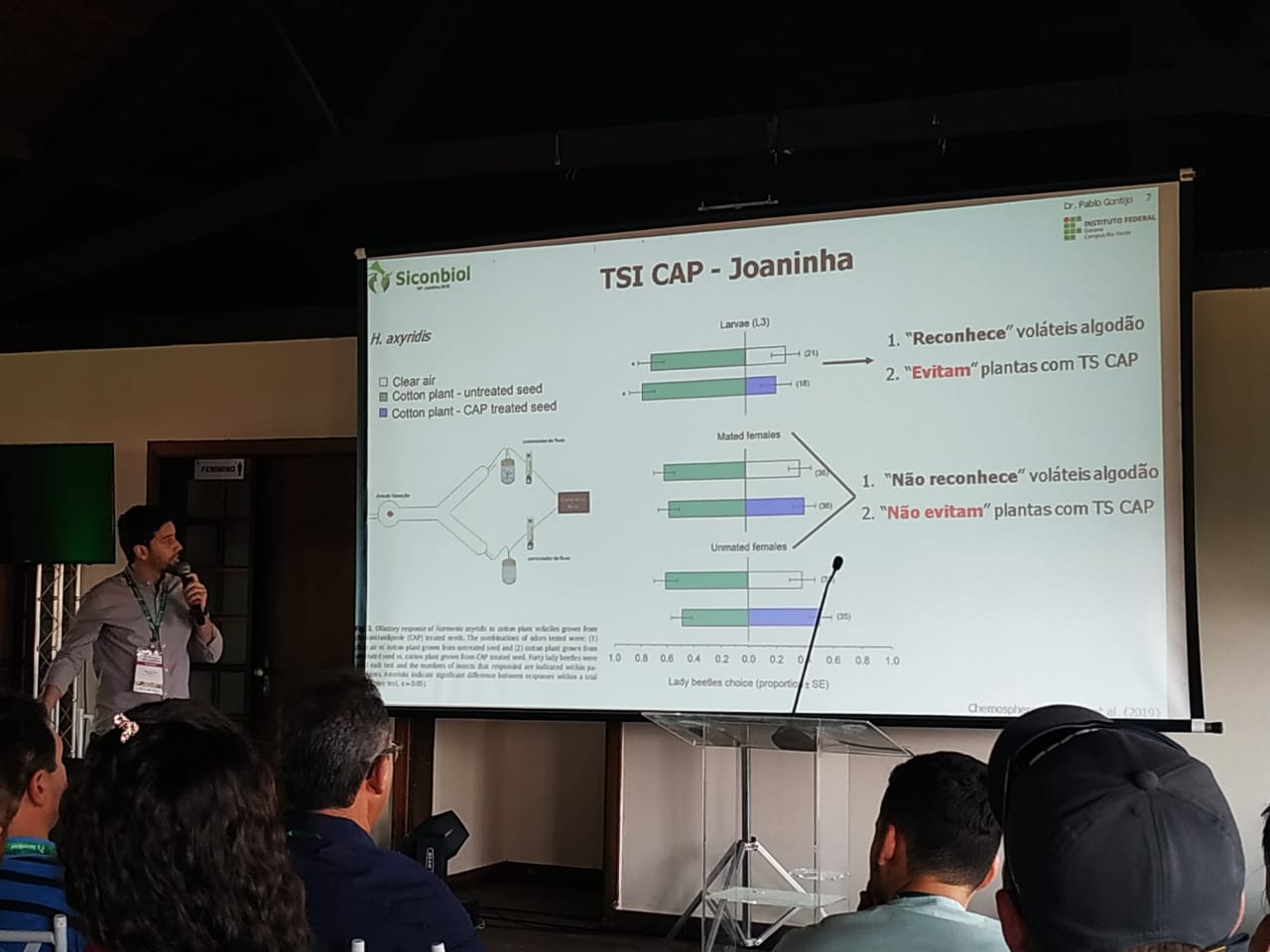 Professor Pablo falou sobre a seletividade de agrotóxicos a inimigos naturais. Segundo ele, a participação no evento foi importante para firmar e reforçar parcerias com instituições de ensino e pesquisa nacionais e internacionais, de países como Argentina e Itália. "Essas novas parcerias podem gerar oportunidades de pesquisa e intercâmbio de estudantes e pesquisadores do IF Goiano - Campus Rio Verde", afirmou.
