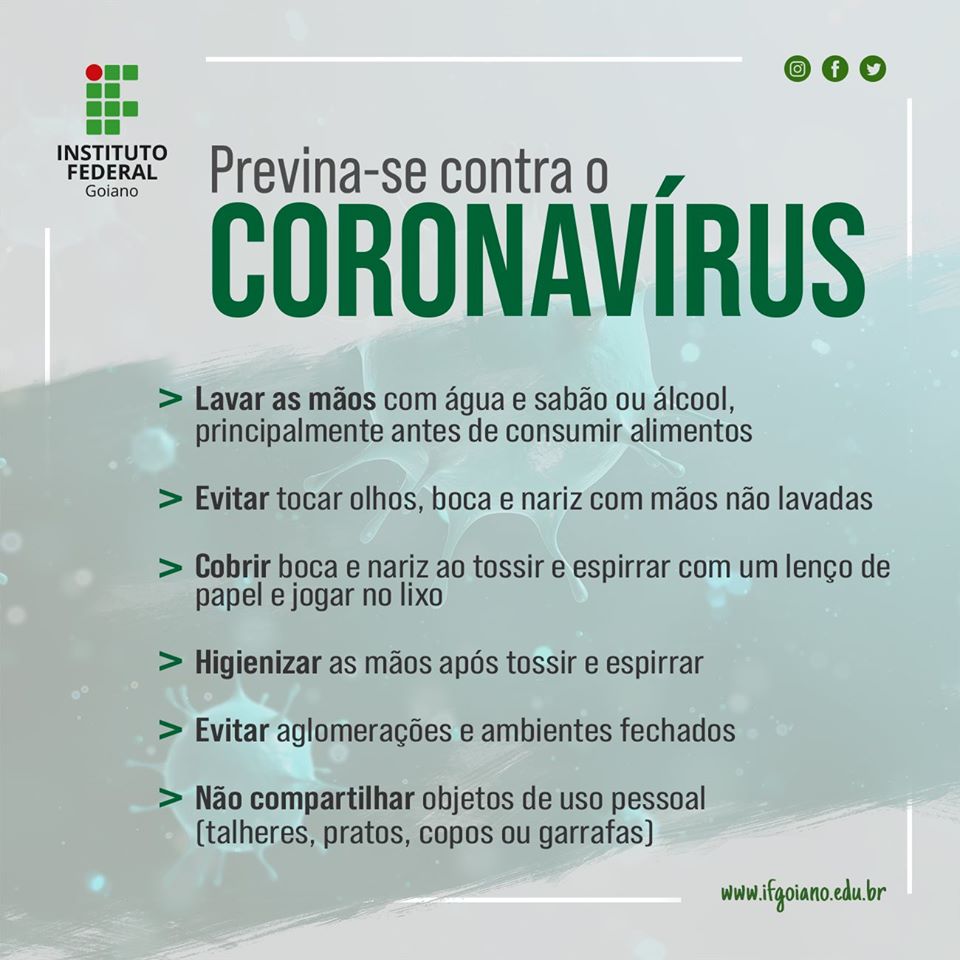 Com o intuito de orientar servidores, alunos e também a comunidade em geral acerca da doença COVID-19, causada pelo coronavírus, o Subsistema Integrado de Atenção à Saúde do Servidor Federal (Siass) IF Goiano/IFG reforça uma série de medidas de como se prevenir da doença. O órgão destaca que as atividades letivas e laborais da Instituição podem ser mantidas normalmente.