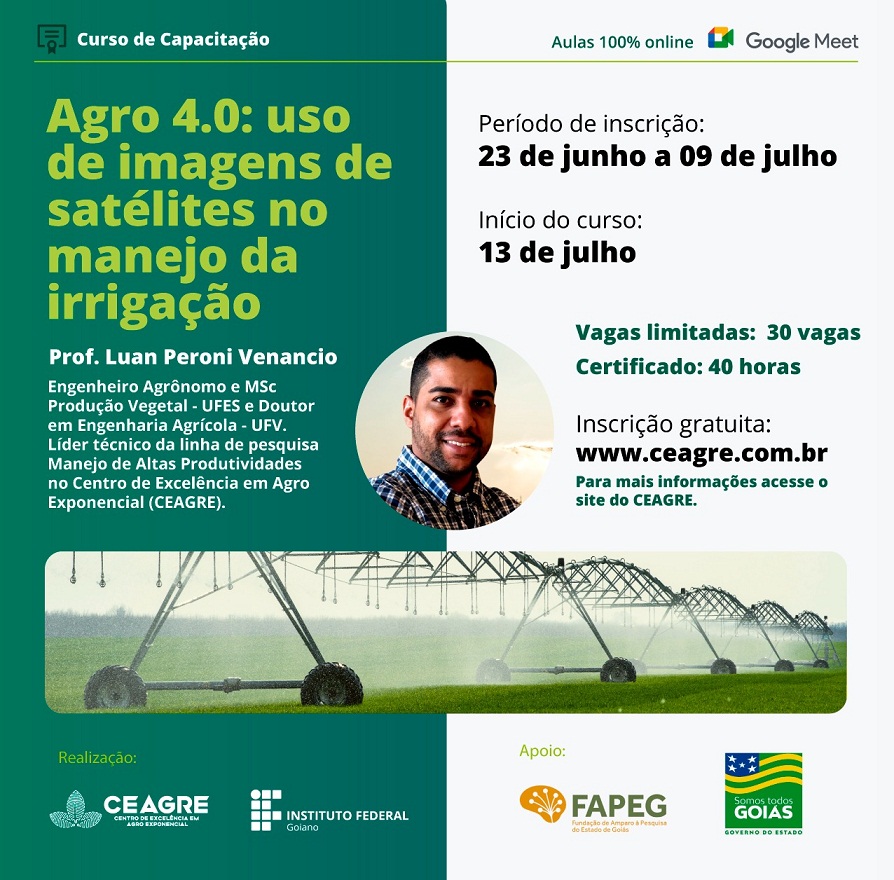 O curso terá como foco o manejo da irrigação por meio de imagens de satélites. Para participar, o aluno deverá estar regularmente matriculado em qualquer uma das unidades do IF Goiano. Interessados devem se inscrever até dia 09 de julho.
