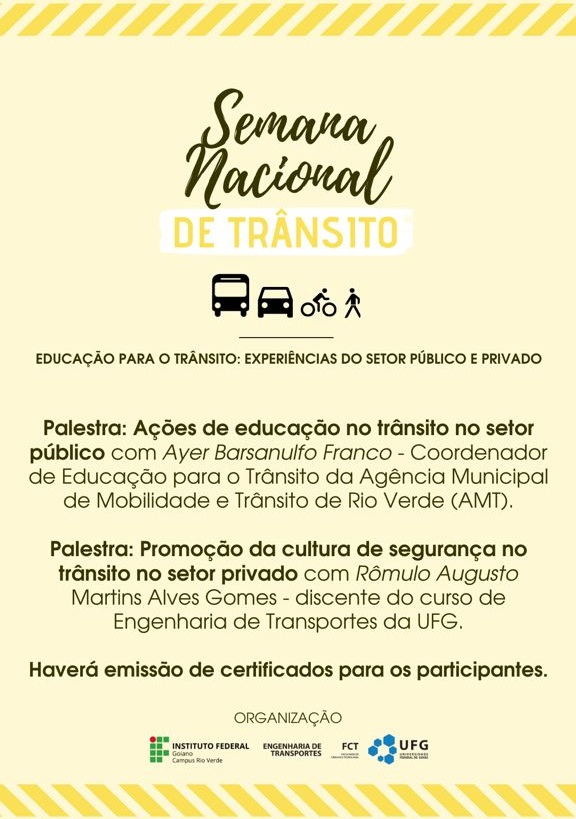 A Semana Nacional de Trânsito de 2021 ocorrerá entre os dias 18 e 25 de setembro. Em comemoração à data o Campus Rio Verde do IF Goiano, a Faculdade de Ciências e Tecnologia da UFG e a Agência Municipal de Mobilidade de Trânsito de Rio Verde estão promovendo um debate online sobre ações desenvolvidas no âmbito da segurança viária.