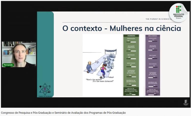 Os desafios da mulher na pesquisa também foram discutidos. Fernanda Staniscuaski, fundadora do Movimento Parent in Science - grupo de cientistas engajados na promoção de um ambiente mais justo na academia para cientistas mães e pais -, discorreu sobre a temática "Parentalidade na Academia: o Movimento Parent in Science".