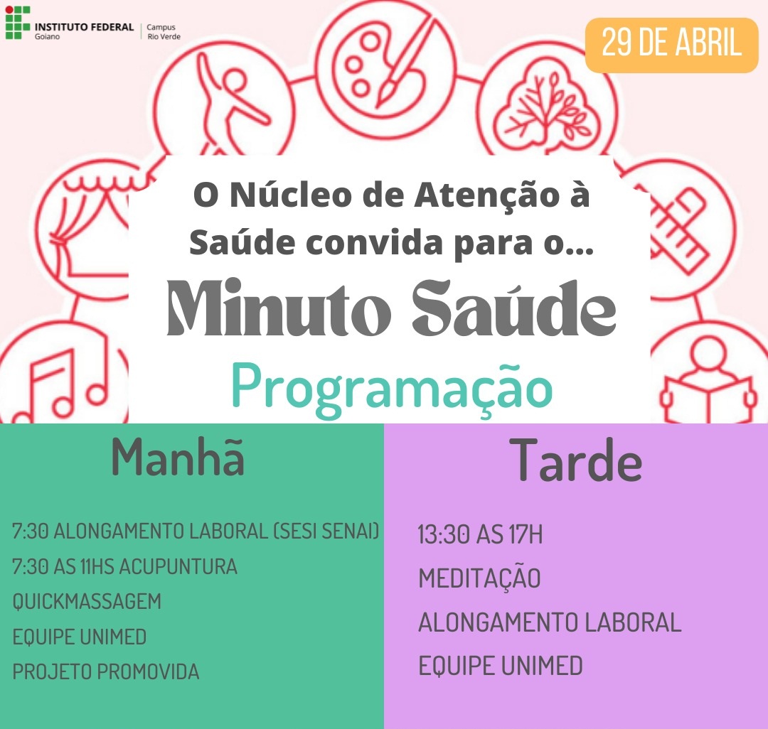 Será um dia inteiro de atividades voltadas à saúde, como alongamento laboral, acupuntura e quickmassagem. A ação é organizada pelo Núcleo de Atenção à Saúde do Campus Rio Verde e ocorrerá nesta sexta-feira, dia 29.