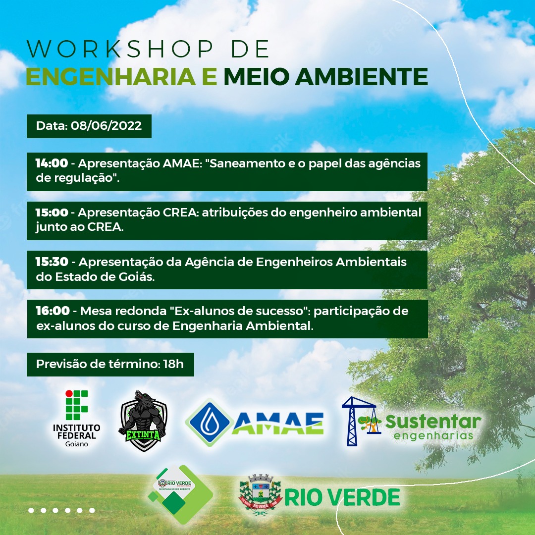 As atividades serão realizadas pelo Campus Rio Verde em parceria com a Agência Municipal de Regulação dos Serviços de Água e Esgoto (AMAE), Diretório Acadêmico e Secretaria Municipal de Meio Ambiente (SEMMA). Faz parte das comemorações da Semana do Meio Ambiente. Nesta quarta-feira, dia 08.
