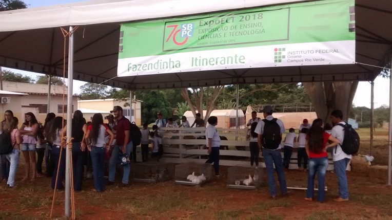 Um pouco mais à frente, a turma encontra a Fazendinha Itinerante, um espaço com animais de pequeno e médio porte. As aves são as que mais chamam a atenção, principalmente das crianças menores.