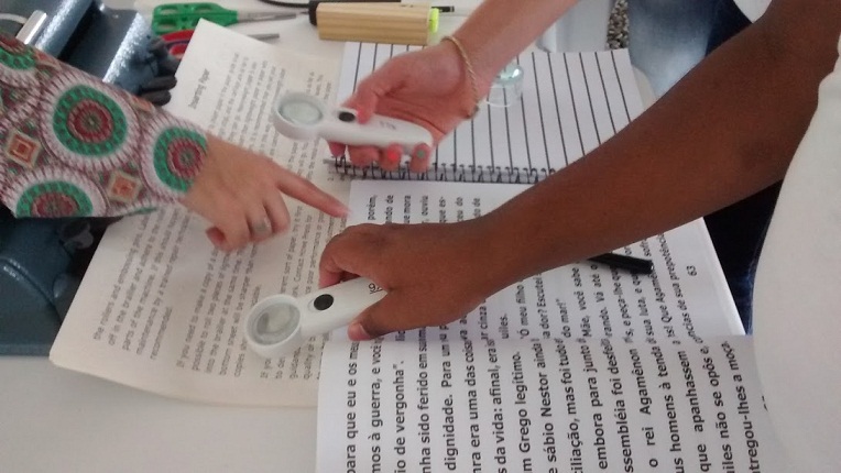 Interação também no espaço destinado ao Núcleo de Apoio aos Portadores de Necessidades Específicas (Napne), em que os estudantes são motivados a manusear instrumentos usados por pessoas com dificuldades visuais, como lupas que facilitam as leituras.