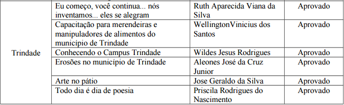 O Instituto Federal Goiano (IF Goiano), por meio da Pró-Reitoria de Extensão (Proex), divulga resultado final da seleção de bolsas de apoio a projetos de extensão para os campi Campos Belos, Catalão, Cristalina, Hidrolândia, Ipameri, Posse e Trindade (veja link abaixo). Foram disponibilizadas 49 bolsas no valor de 200 reais para fomentar as atividades nas unidades contempladas.