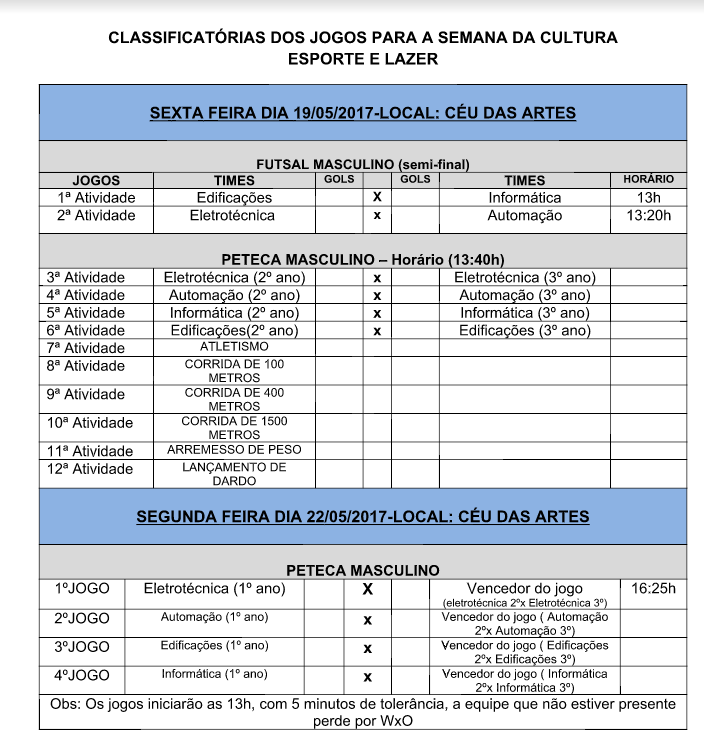 Além do futsal outras seis modalidades compõem os Jogos da III Semana: vôlei misto, basquete, peteca, xadrez, tênis de mesa e atletismo (corrida, arremesso de peso e lançamento de dardo). Veja abaixo os próximos jogos.
