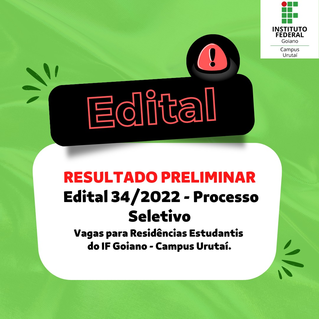 Está lançado o edital 34/2022 para o Processo Seletivo de acesso as vagas das Residências Estudantis do IF Goiano - Campus Urutaí.