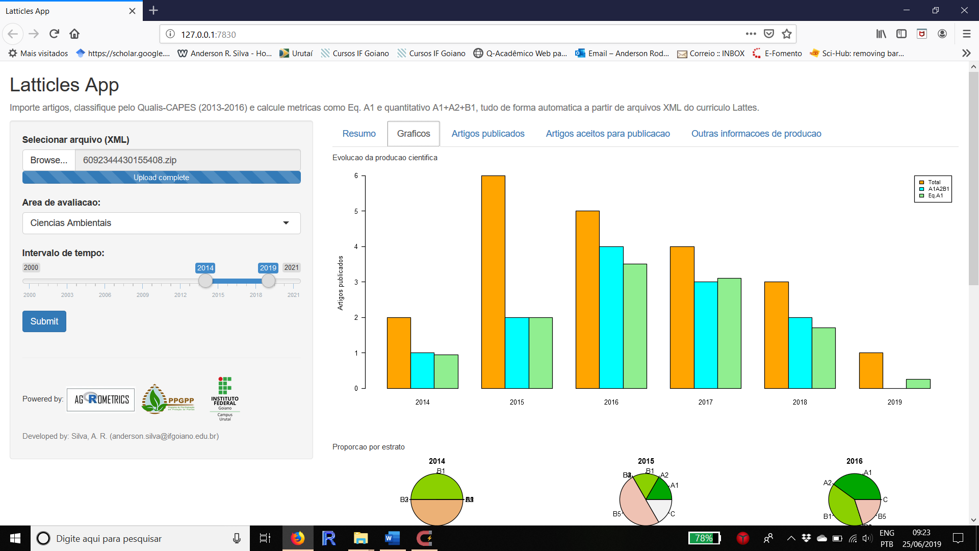 O aplicativo web-based foi construído em linguagem R pelo professor Anderson Rodrigo da Silva para avaliação das produções científicas contidas na Plataforma Lattes do CNPq, em especial as publicadas em periódicos cadastrados no Qualis-CAPES. “Trata-se de uma ferramenta de gestão institucional da Pesquisa e Pós-Graduação que permite importar artigos, classificar pelo Qualis e calcular métricas como Equivalente A1 e quantitativo A1+A2+B1, tudo de forma automática a partir de arquivos XML do currículo Lattes do pesquisador. No processo seletivo PIBIC/PIBITI 2019 usamos a versão beta (de testes) - mais de 100 currículos Lattes foram analisados em apenas uma tarde!”