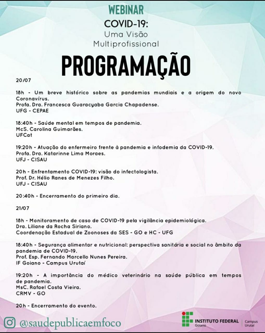 A equipe do Projeto de Extensão “Saúde Pública em Foco – Covid-19 e colaboradores do Campus Urutaí irá promover o evento online Webinar Covid-19: Uma Visão Multiprofissional, nos dias 20 e 21 de julho, a partir das 18h, na plataforma Google Meet. O evento contará com a participação de profissionais das diversas áreas da saúde, como Medicina, Enfermagem, Biologia, Nutrição, Psicologia, e Medicina Veterinária, e com uma visão multiprofissional serão discutidos diversos aspectos acerca da atual pandemia.