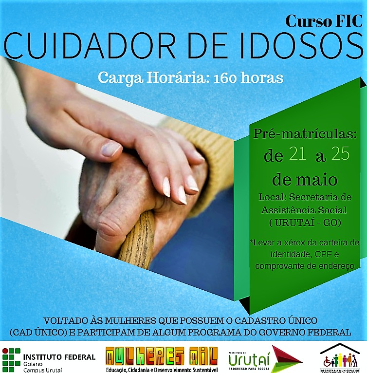 O Instituto Federal Goiano Campus Urutaí, em parceria com a Prefeitura Municipal de Urutaí, por meio da Secretaria de Assistência Social, comunica que estão abertas as pré-matrículas para o curso de Cuidador de Idosos. O curso é voltado às mulheres que possuem o Cadastro Único (Cad Único) e que participam de algum programa do Governo Federal. As interessadas poderão fazer a pré-matrícula até o dia 25 de maio, na Secretaria de Assistência Social do município.