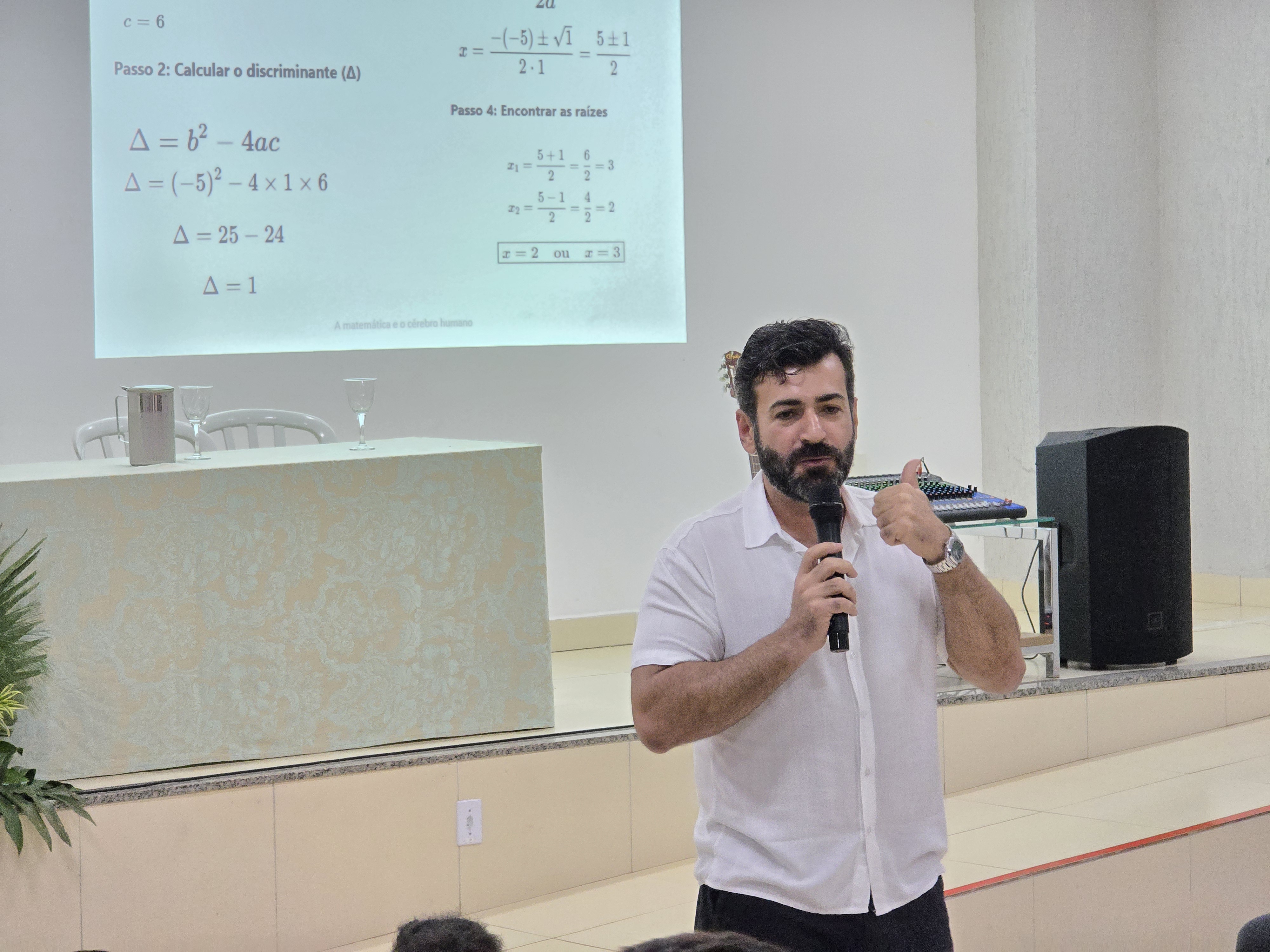 Após a apresentação do Programa e as falas da mesa diretiva, os estudantes participaram da aula Por que Bhaskara se eu nunca vou usar? A neurociência explica!, ministrada pelo docente Dhiego Gonçalves, do próprio Campus Ceres, e integrante da equipe do Partiu IF. Foi uma aula curta e interativa, que buscou mostrar aos estudantes as possibilidades de aprenderem um conteúdo considerado “difícil” de forma intuitiva e com aplicabilidade.